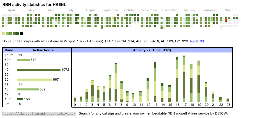 The heatmap shows the activity as reported by the RBN (CW/PSK/RTTY, no FT8) of the last 12 months. You can scroll back to January 2015.