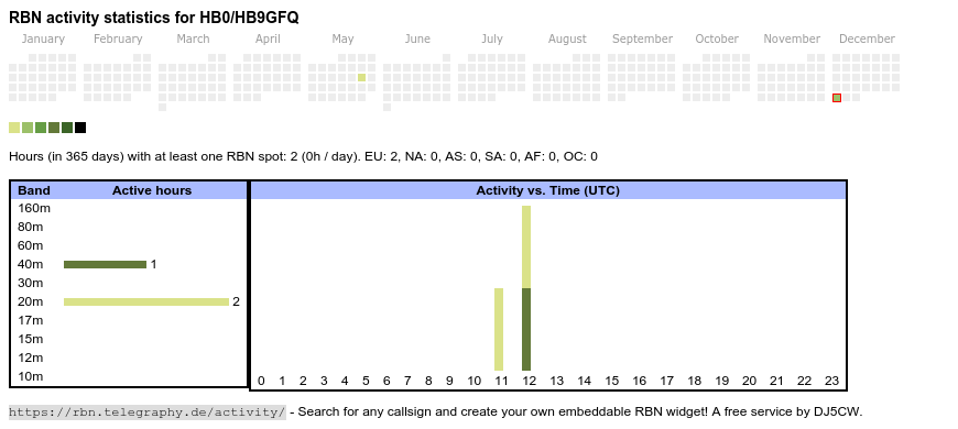 The heatmap shows the activity as reported by the RBN (CW/PSK/RTTY, no FT8) of the last 12 months. You can scroll back to January 2015.