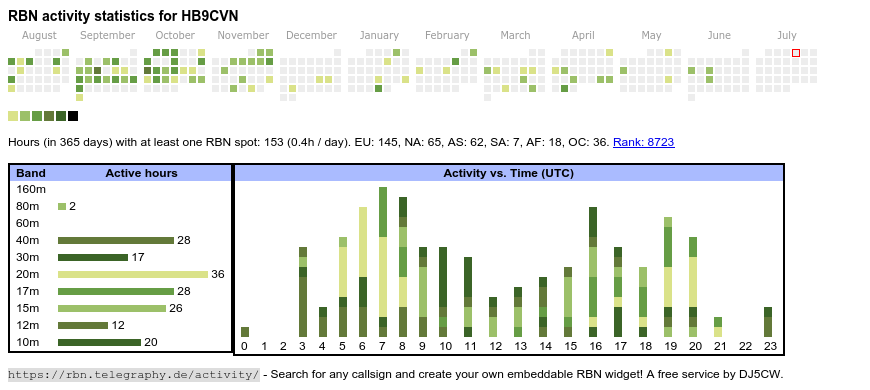The heatmap shows the activity as reported by the RBN (CW/PSK/RTTY, no FT8) of the last 12 months. You can scroll back to January 2015.