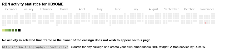 The heatmap shows the activity as reported by the RBN (CW/PSK/RTTY, no FT8) of the last 12 months. You can scroll back to January 2015.