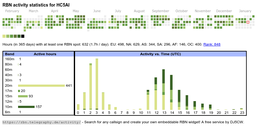 The heatmap shows the activity as reported by the RBN (CW/PSK/RTTY, no FT8) of the last 12 months. You can scroll back to January 2015.