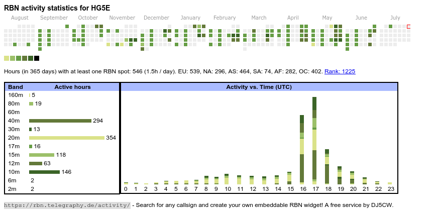 The heatmap shows the activity as reported by the RBN (CW/PSK/RTTY, no FT8) of the last 12 months. You can scroll back to January 2015.