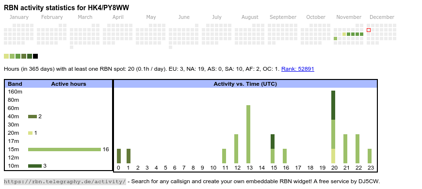 The heatmap shows the activity as reported by the RBN (CW/PSK/RTTY, no FT8) of the last 12 months. You can scroll back to January 2015.
