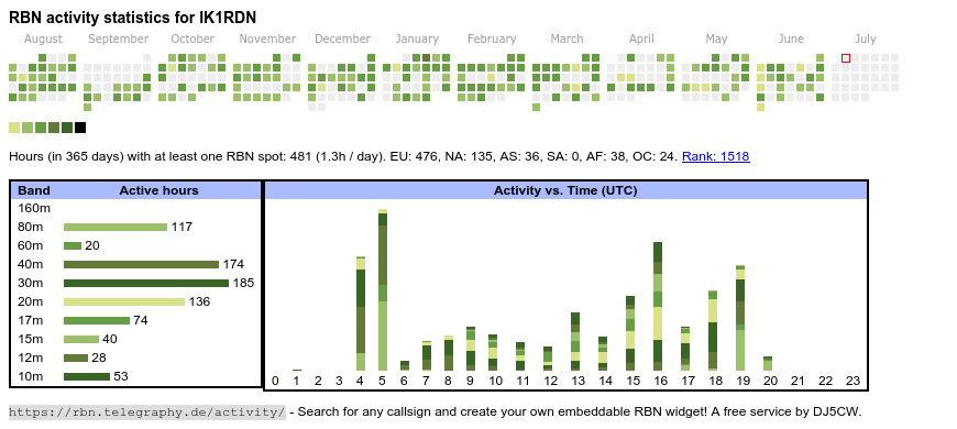 The heatmap shows the activity as reported by the RBN (CW/PSK/RTTY, no FT8) of the last 12 months. You can scroll back to January 2015.