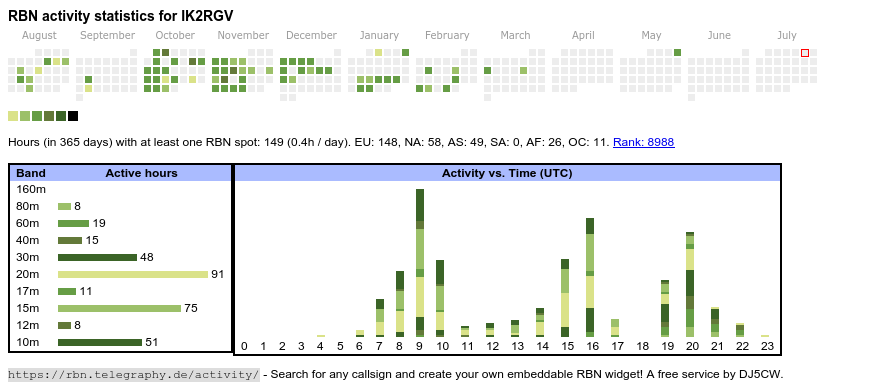 The heatmap shows the activity as reported by the RBN (CW/PSK/RTTY, no FT8) of the last 12 months. You can scroll back to January 2015.