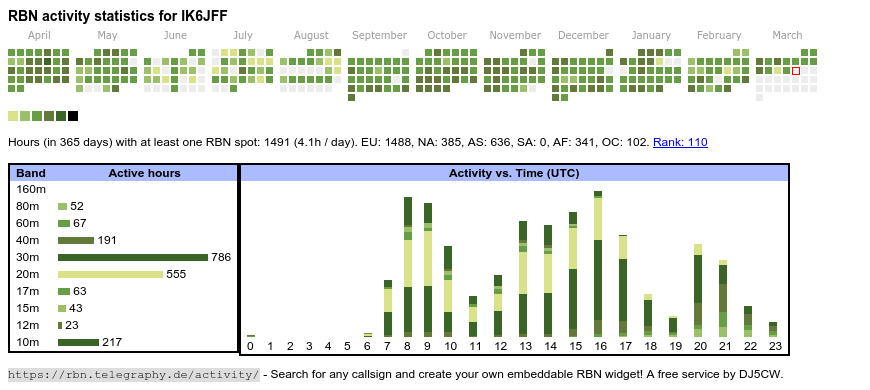The heatmap shows the activity as reported by the RBN (CW/PSK/RTTY, no FT8) of the last 12 months. You can scroll back to January 2015.