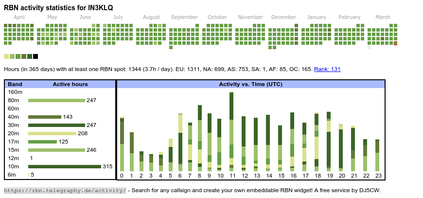 The heatmap shows the activity as reported by the RBN (CW/PSK/RTTY, no FT8) of the last 12 months. You can scroll back to January 2015.