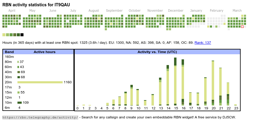 The heatmap shows the activity as reported by the RBN (CW/PSK/RTTY, no FT8) of the last 12 months. You can scroll back to January 2015.