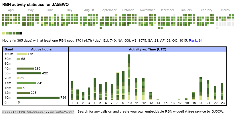 The heatmap shows the activity as reported by the RBN (CW/PSK/RTTY, no FT8) of the last 12 months. You can scroll back to January 2015.