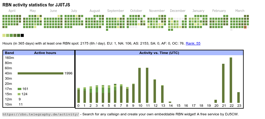 The heatmap shows the activity as reported by the RBN (CW/PSK/RTTY, no FT8) of the last 12 months. You can scroll back to January 2015.