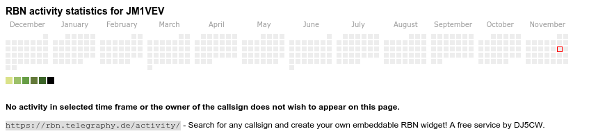 The heatmap shows the activity as reported by the RBN (CW/PSK/RTTY, no FT8) of the last 12 months. You can scroll back to January 2015.