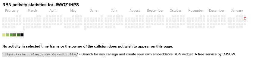 The heatmap shows the activity as reported by the RBN (CW/PSK/RTTY, no FT8) of the last 12 months. You can scroll back to January 2015.