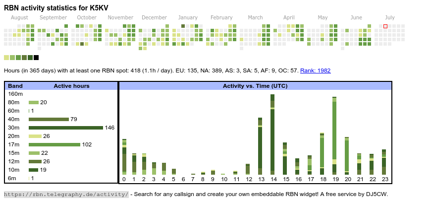 The heatmap shows the activity as reported by the RBN (CW/PSK/RTTY, no FT8) of the last 12 months. You can scroll back to January 2015.