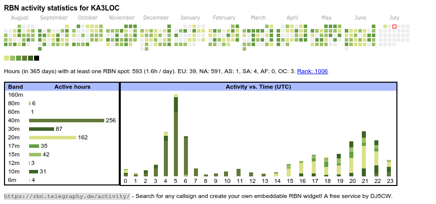 The heatmap shows the activity as reported by the RBN (CW/PSK/RTTY, no FT8) of the last 12 months. You can scroll back to January 2015.