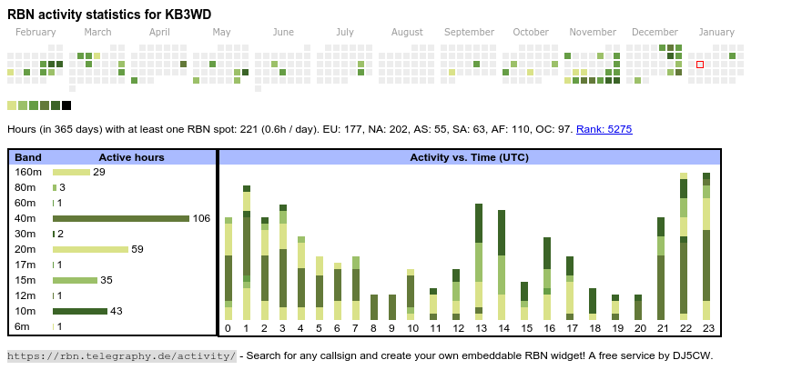The heatmap shows the activity as reported by the RBN (CW/PSK/RTTY, no FT8) of the last 12 months. You can scroll back to January 2015.