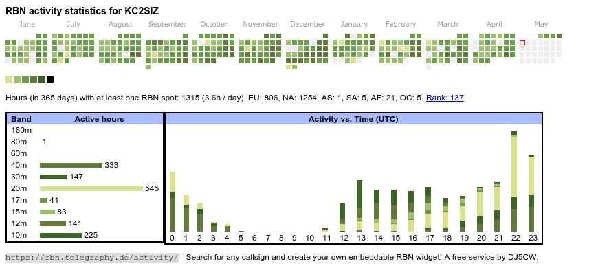 The heatmap shows the activity as reported by the RBN (CW/PSK/RTTY, no FT8) of the last 12 months. You can scroll back to January 2015.