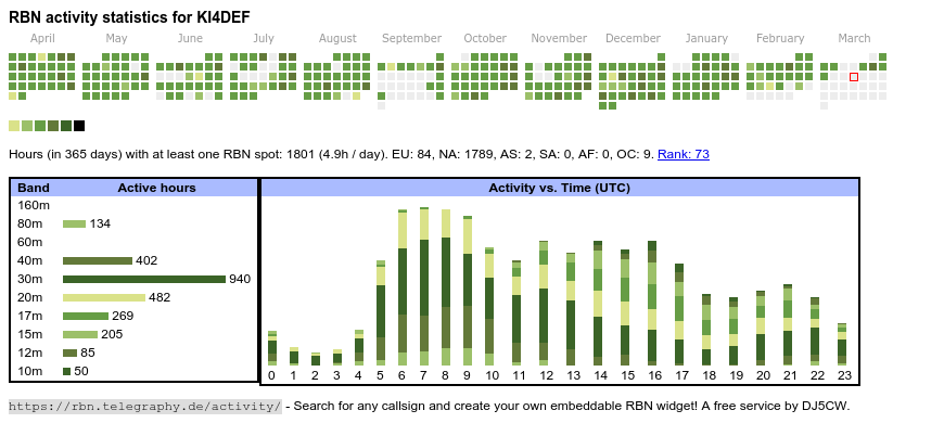 The heatmap shows the activity as reported by the RBN (CW/PSK/RTTY, no FT8) of the last 12 months. You can scroll back to January 2015.