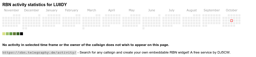 The heatmap shows the activity as reported by the RBN (CW/PSK/RTTY, no FT8) of the last 12 months. You can scroll back to January 2015.