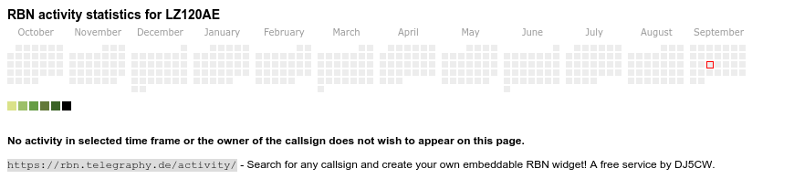 The heatmap shows the activity as reported by the RBN (CW/PSK/RTTY, no FT8) of the last 12 months. You can scroll back to January 2015.