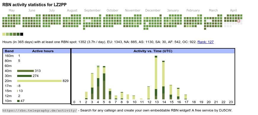 The heatmap shows the activity as reported by the RBN (CW/PSK/RTTY, no FT8) of the last 12 months. You can scroll back to January 2015.