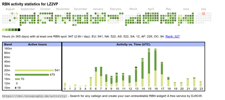 The heatmap shows the activity as reported by the RBN (CW/PSK/RTTY, no FT8) of the last 12 months. You can scroll back to January 2015.