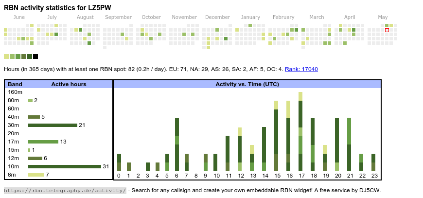 The heatmap shows the activity as reported by the RBN (CW/PSK/RTTY, no FT8) of the last 12 months. You can scroll back to January 2015.