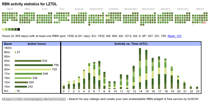 The heatmap shows the activity as reported by the RBN (CW/PSK/RTTY, no FT8) of the last 12 months. You can scroll back to January 2015.