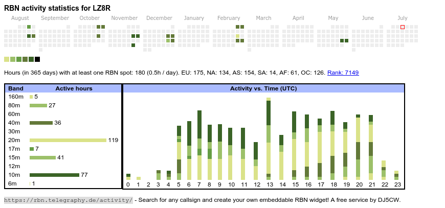 The heatmap shows the activity as reported by the RBN (CW/PSK/RTTY, no FT8) of the last 12 months. You can scroll back to January 2015.