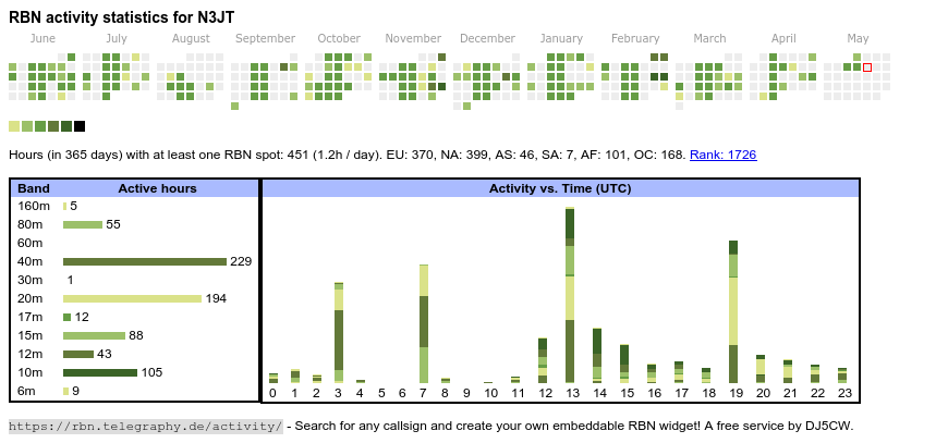 The heatmap shows the activity as reported by the RBN (CW/PSK/RTTY, no FT8) of the last 12 months. You can scroll back to January 2015.