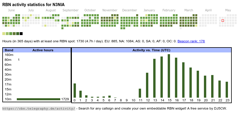 The heatmap shows the activity as reported by the RBN (CW/PSK/RTTY, no FT8) of the last 12 months. You can scroll back to January 2015.