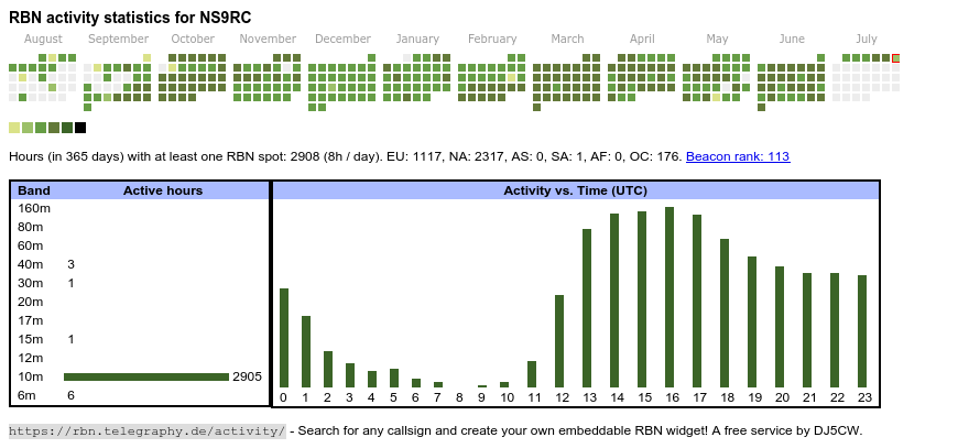 The heatmap shows the activity as reported by the RBN (CW/PSK/RTTY, no FT8) of the last 12 months. You can scroll back to January 2015.