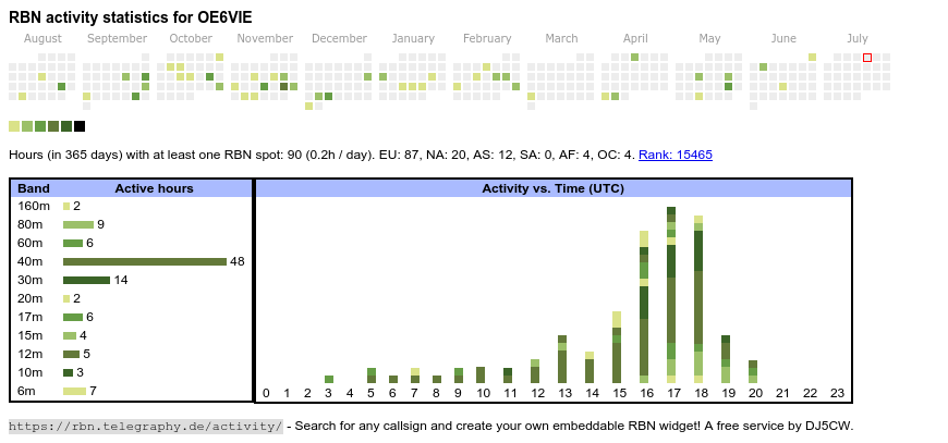 The heatmap shows the activity as reported by the RBN (CW/PSK/RTTY, no FT8) of the last 12 months. You can scroll back to January 2015.