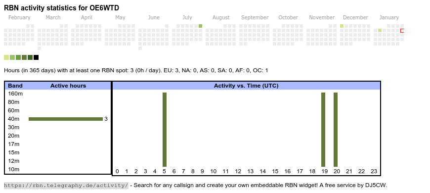 The heatmap shows the activity as reported by the RBN (CW/PSK/RTTY, no FT8) of the last 12 months. You can scroll back to January 2015.