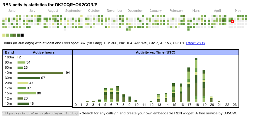 The heatmap shows the activity as reported by the RBN (CW/PSK/RTTY, no FT8) of the last 12 months. You can scroll back to January 2015.