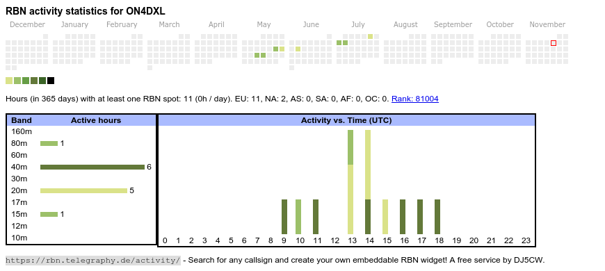 The heatmap shows the activity as reported by the RBN (CW/PSK/RTTY, no FT8) of the last 12 months. You can scroll back to January 2015.