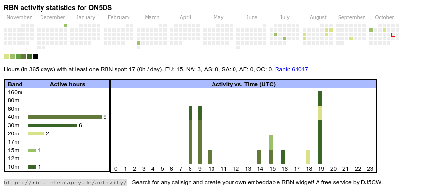 The heatmap shows the activity as reported by the RBN (CW/PSK/RTTY, no FT8) of the last 12 months. You can scroll back to January 2015.