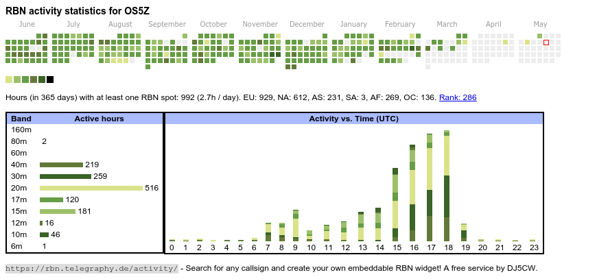 The heatmap shows the activity as reported by the RBN (CW/PSK/RTTY, no FT8) of the last 12 months. You can scroll back to January 2015.