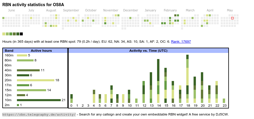 The heatmap shows the activity as reported by the RBN (CW/PSK/RTTY, no FT8) of the last 12 months. You can scroll back to January 2015.