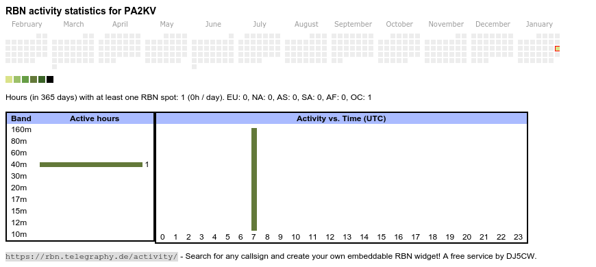 The heatmap shows the activity as reported by the RBN (CW/PSK/RTTY, no FT8) of the last 12 months. You can scroll back to January 2015.
