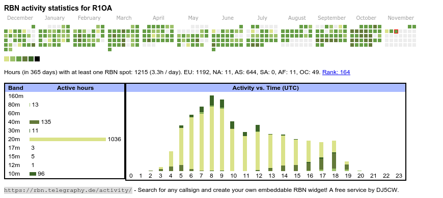 The heatmap shows the activity as reported by the RBN (CW/PSK/RTTY, no FT8) of the last 12 months. You can scroll back to January 2015.