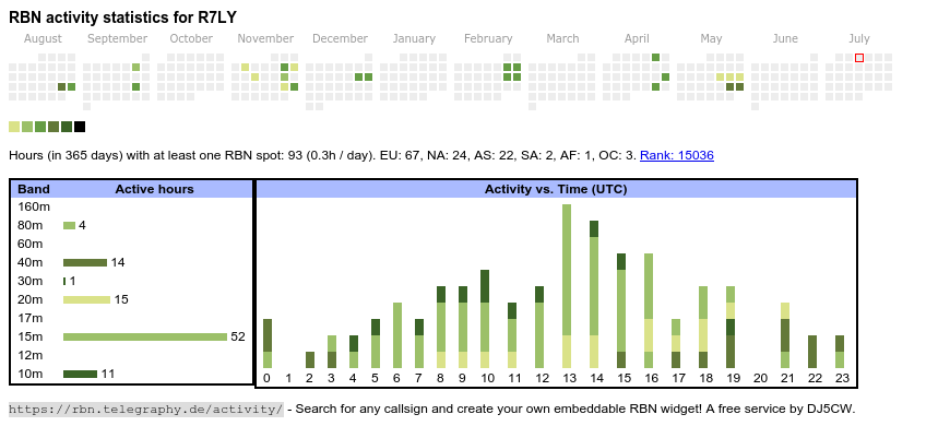 The heatmap shows the activity as reported by the RBN (CW/PSK/RTTY, no FT8) of the last 12 months. You can scroll back to January 2015.