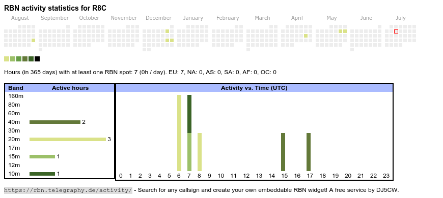 The heatmap shows the activity as reported by the RBN (CW/PSK/RTTY, no FT8) of the last 12 months. You can scroll back to January 2015.