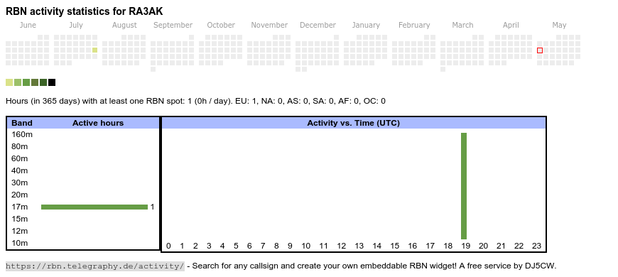 The heatmap shows the activity as reported by the RBN (CW/PSK/RTTY, no FT8) of the last 12 months. You can scroll back to January 2015.