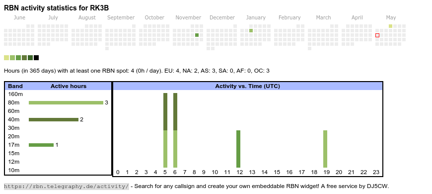 The heatmap shows the activity as reported by the RBN (CW/PSK/RTTY, no FT8) of the last 12 months. You can scroll back to January 2015.