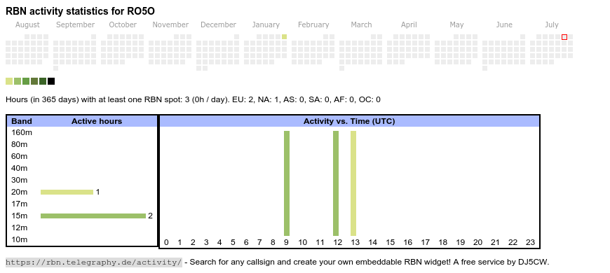 The heatmap shows the activity as reported by the RBN (CW/PSK/RTTY, no FT8) of the last 12 months. You can scroll back to January 2015.