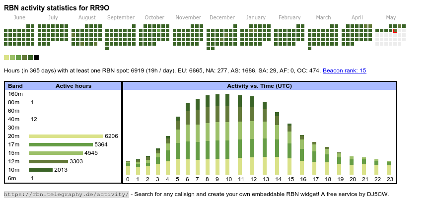 The heatmap shows the activity as reported by the RBN (CW/PSK/RTTY, no FT8) of the last 12 months. You can scroll back to January 2015.