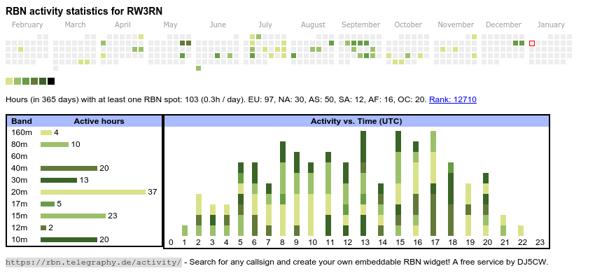 The heatmap shows the activity as reported by the RBN (CW/PSK/RTTY, no FT8) of the last 12 months. You can scroll back to January 2015.