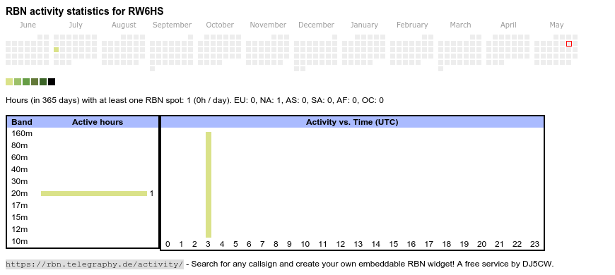 The heatmap shows the activity as reported by the RBN (CW/PSK/RTTY, no FT8) of the last 12 months. You can scroll back to January 2015.