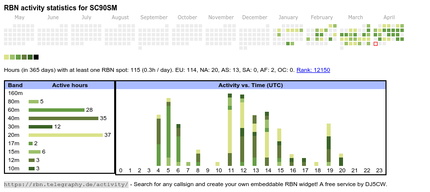 The heatmap shows the activity as reported by the RBN (CW/PSK/RTTY, no FT8) of the last 12 months. You can scroll back to January 2015.