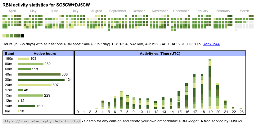 The heatmap shows the activity as reported by the RBN (CW/PSK/RTTY, no FT8) of the last 12 months. You can scroll back to January 2015.